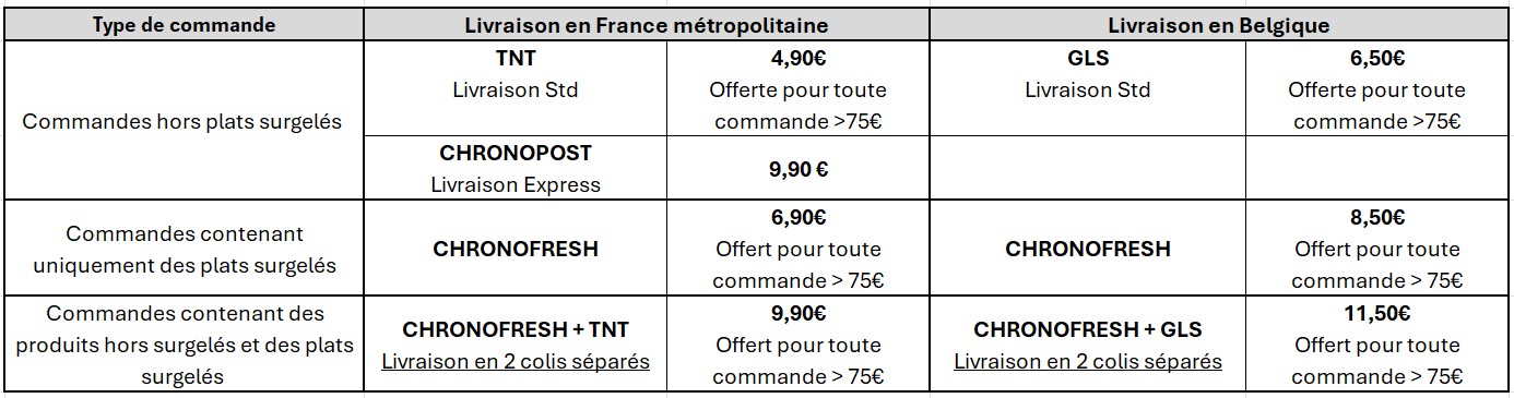 La livraison des plats surgelés est effectuée par Chronofresh qui assure un service de transport frigorifique adapté pour vos plats surgelés, dans le respect de la chaîne du froid. |