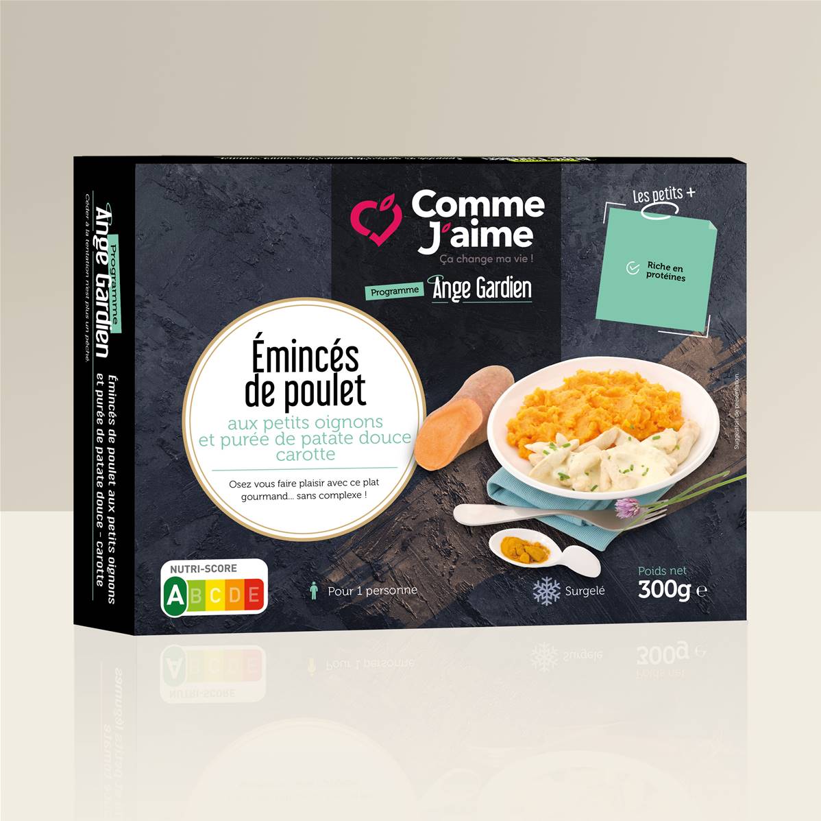 Emincé de poulet cuit 30% (viande de cuisse de poulet 25,5% (origine : France), eau, fécule de manioc, sel), eau, patate douce 18,9%, carotte 16,8%,