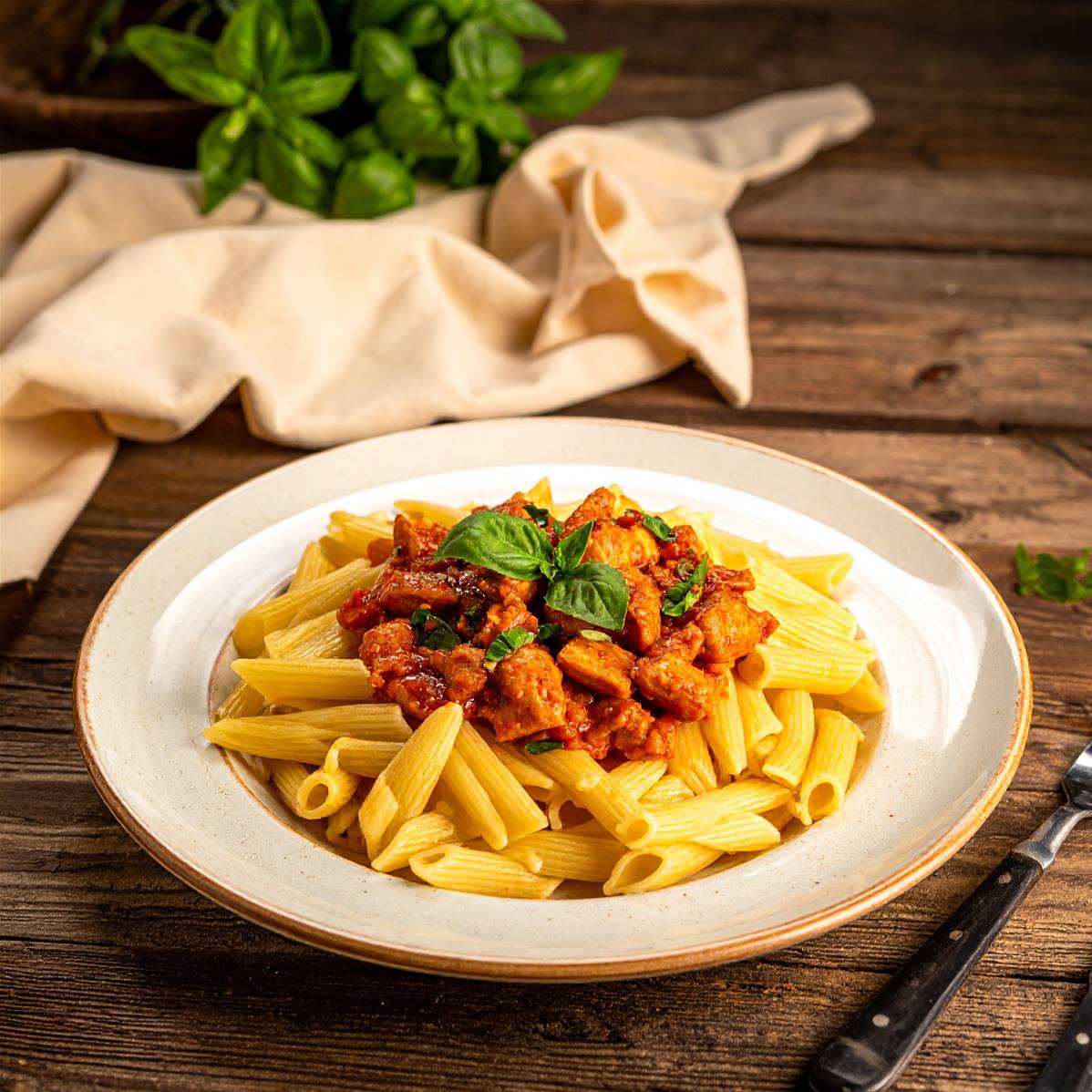 Savourez un plat ensoleillé aux saveurs d’Italie ! De tendres émincés de poulet accompagnés de penne et nappés d’une sauce napolitaine riche en goût, à base de tomate, d'oignons, de basilic et une touche de piment pour relever le tout. Un repas généreux et plein de caractère !