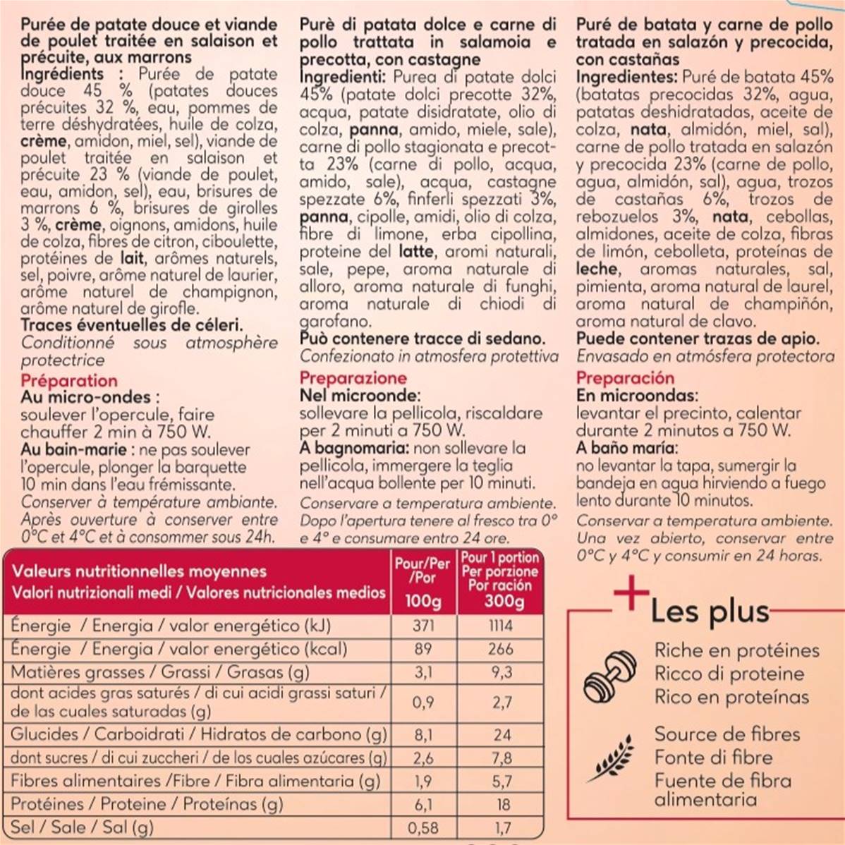 Ingrédients : Purée de patate douce 45 % (patates douces précuites 32 %, eau, pommes de terre déshydratées, huile de colza, crème, amidon, miel, sel), viande de poulet traitée en salaison et précuite 23 % (viande de poulet [origine : France], eau, amidon, sel), eau, brisures de marrons 6 %, brisures de girolles 3 %, crème, oignons, amidons, huile de colza, fibres de citron, ciboulette, protéines de lait, arômes naturels, sel, poivre, arôme naturel de laurier, arôme naturel de champignon, arôme naturel de girofle.
