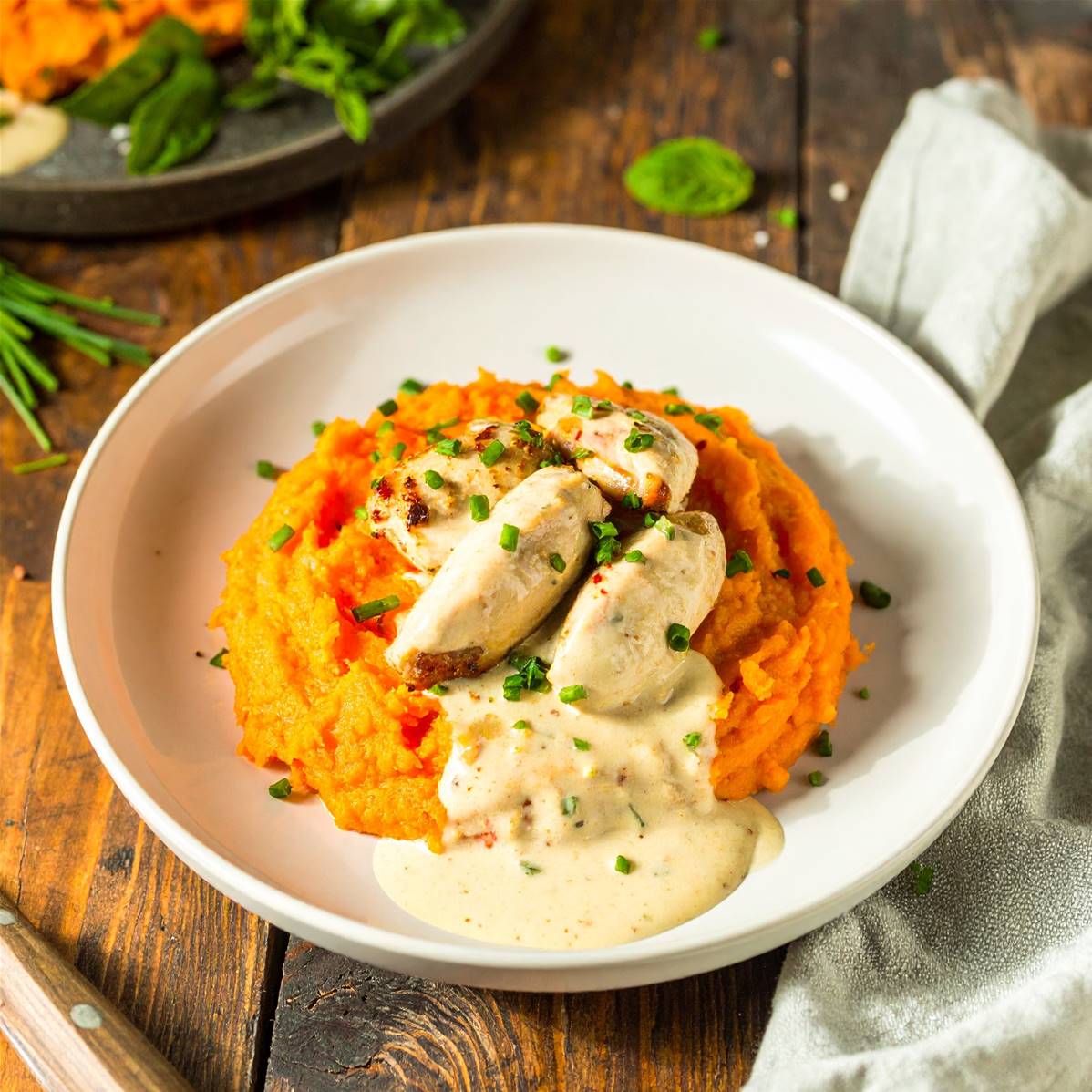 Un émincé de poulet fondant, nappé d'une sauce onctueuse aux oignons et à la ciboulette et accompagné d'une purée fondante de patate douce et carottes. Un plat coloré et réconfortant, aux saveurs légèrement sucrées. Viande 100% française en savoir +
